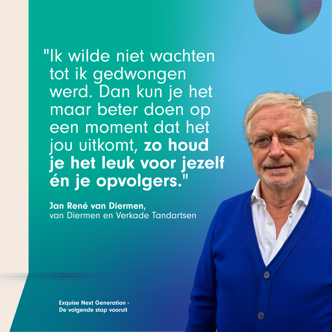 Tandarts Van Diermen stapte bewust over op Exquise Next Generation, nog vóór hij zijn praktijk overdroeg aan zijn dochter en een collega. “Ik wilde het pakket goed leren kennen, omdat ik ook na de verkoop nog een aantal jaar optimaal wilde blijven meewerken. Bovendien: veranderen houdt het werk leuk.”